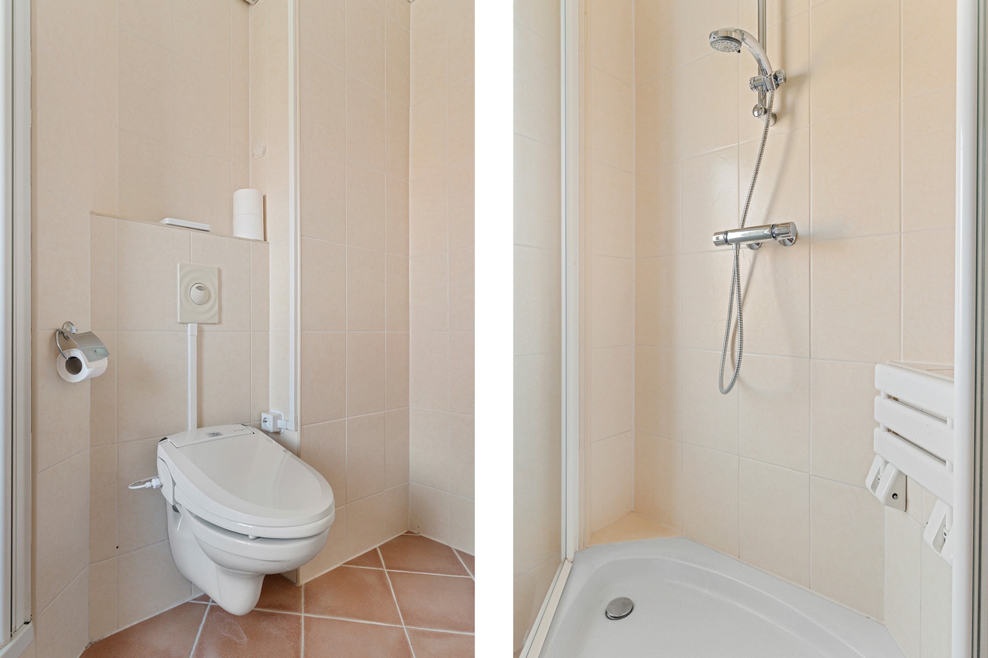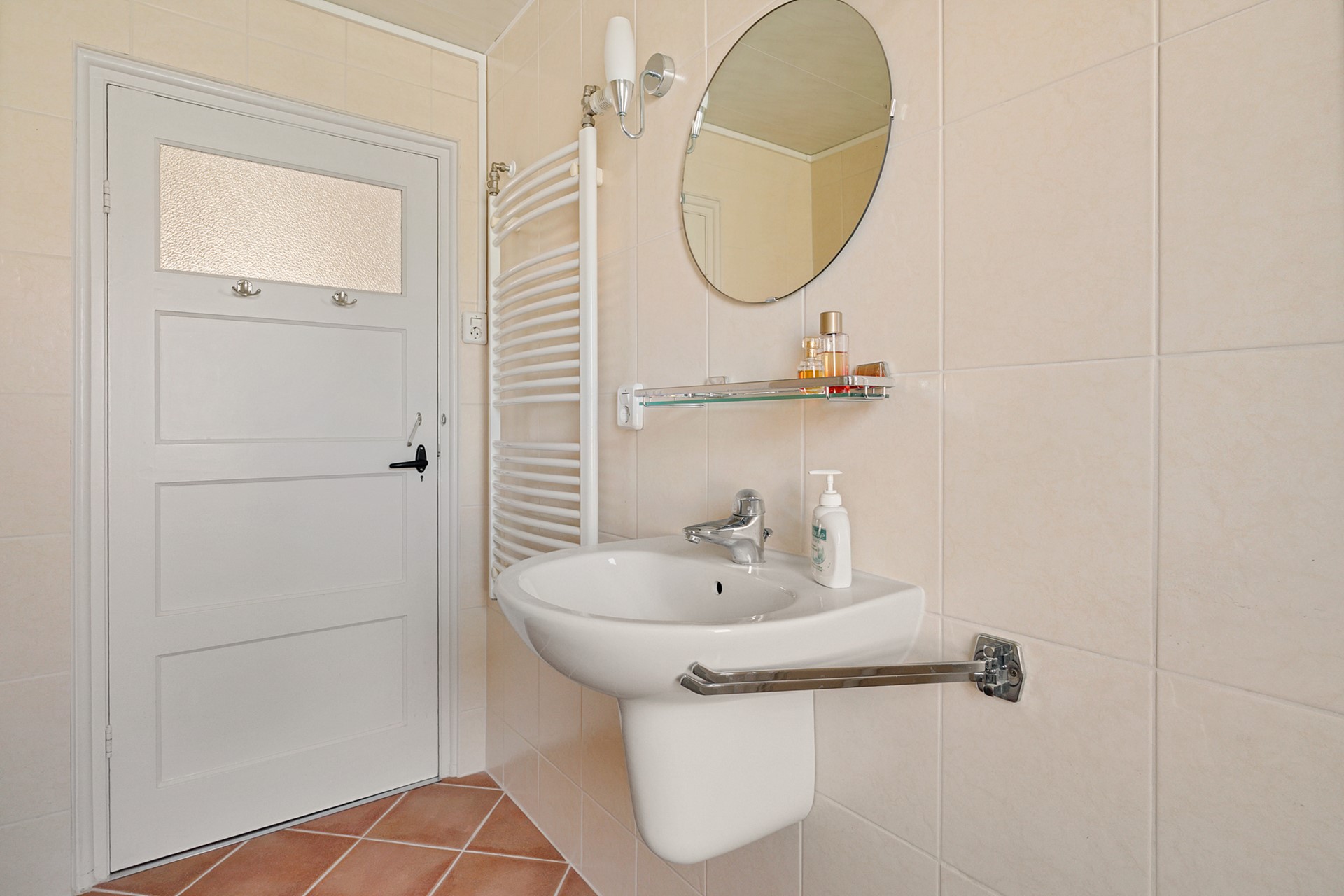* Badkamer met douche, wc, wastafel, wasmachine-aansluiting en designradiator.